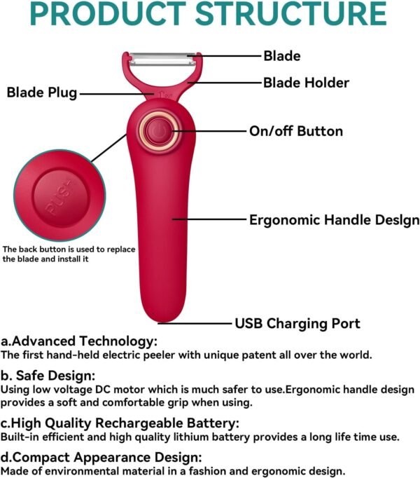 Incluye: 1 pelador eléctrico + 3 cuchillas intercambiables + cable USB