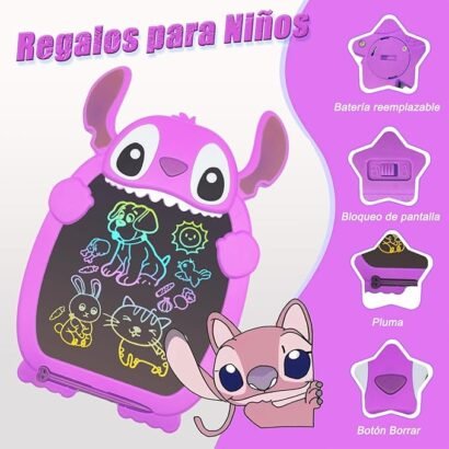 ¡Dibuja, escribe y juega sin límites! Esta divertida pizarra electrónica inspirada en Stitch es el compañero perfecto para estimular la creatividad de los más pequeños. Ideal como juguete educativo y de entretenimiento, su diseño compacto, liviano y resistente la convierte en una excelente opción para llevar a cualquier parte: en casa, el carro, el avión o en una salida al parque.